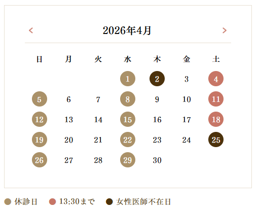 4月の休診日と院長/女性医師不在日について